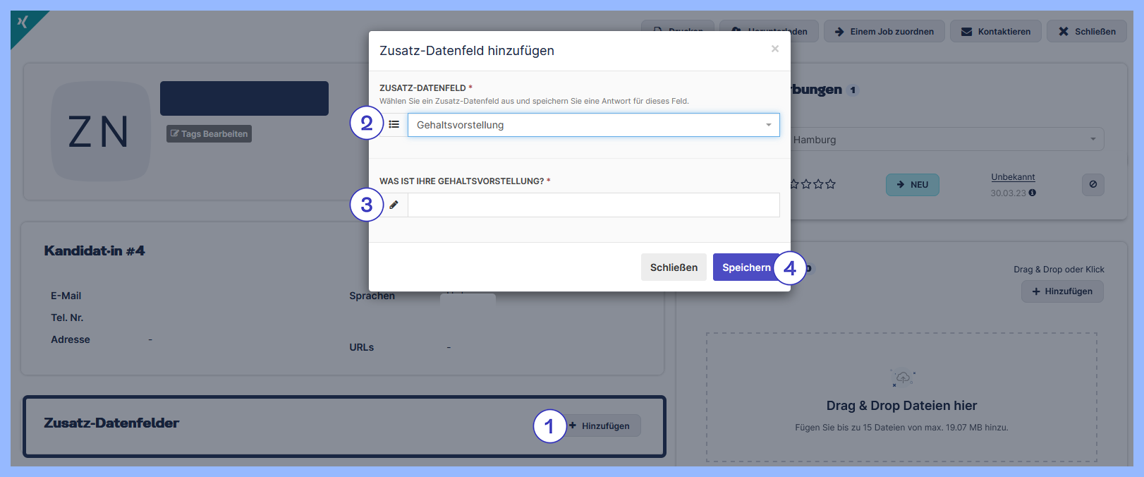 Im Kandidat·innen-Profil können Sie mithilfe der Zusatz-Datenfelder folgende zwei Informationen speichern: