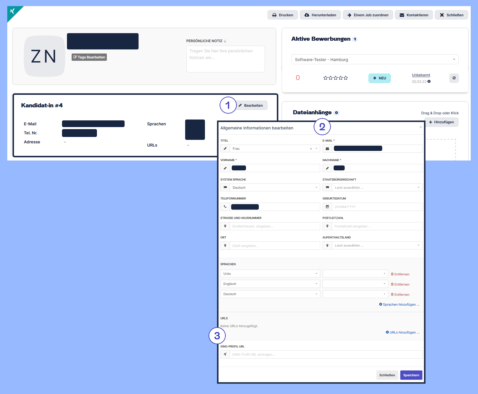 In diesem Bereich werden die Kontaktdaten und Sprachkenntnisse der Bewerbenden angezeigt. Klicken Sie auf „Bearbeiten“ (1) um Daten hinzuzufügen oder zu ändern (2). Zusätzlich können Sie auch den Link zum XING Profil oder weitere relevante URLs/Links (3) hinterlegen.