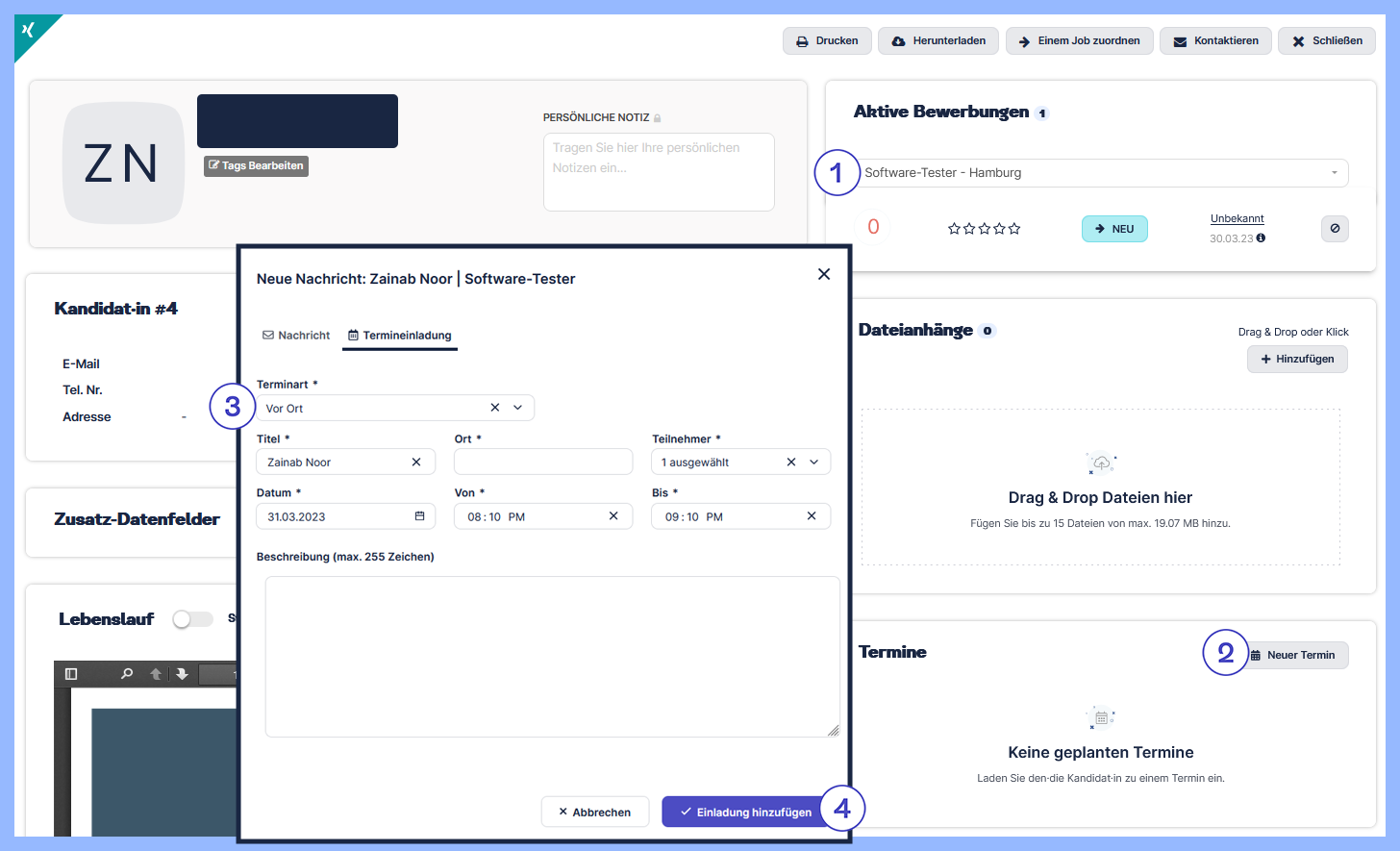 - Auf der linken Seite sehen Sie die Stammdaten der Bewerbenden, Zusatz-Datenfelder, sowie den Lebenslauf.
