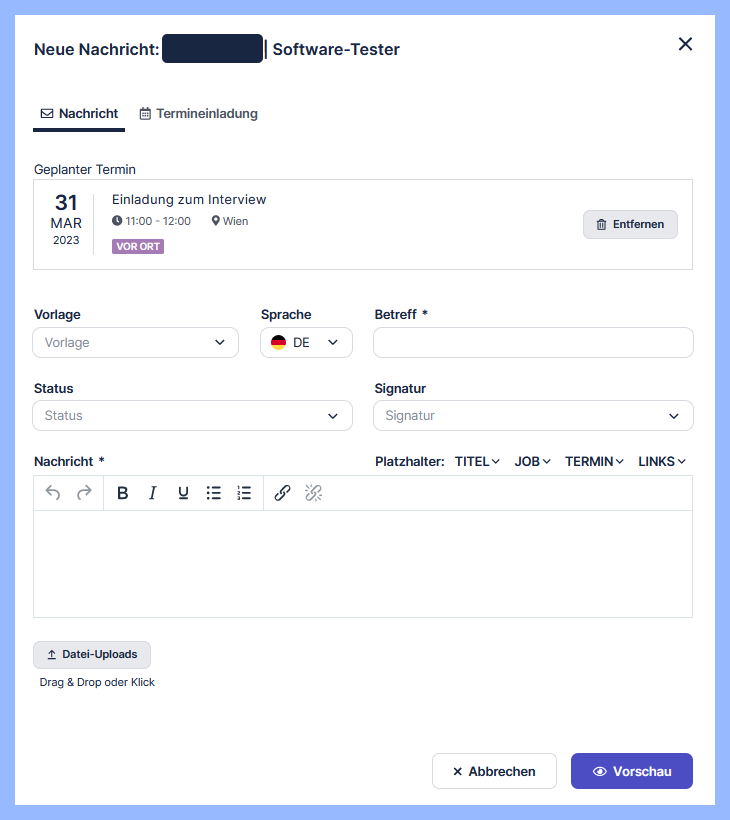 Im nächsten Schritt haben Sie die Möglichkeit Ihrem Kandidaten oder Ihrer Kandidatin eine Nachricht zu schreiben.