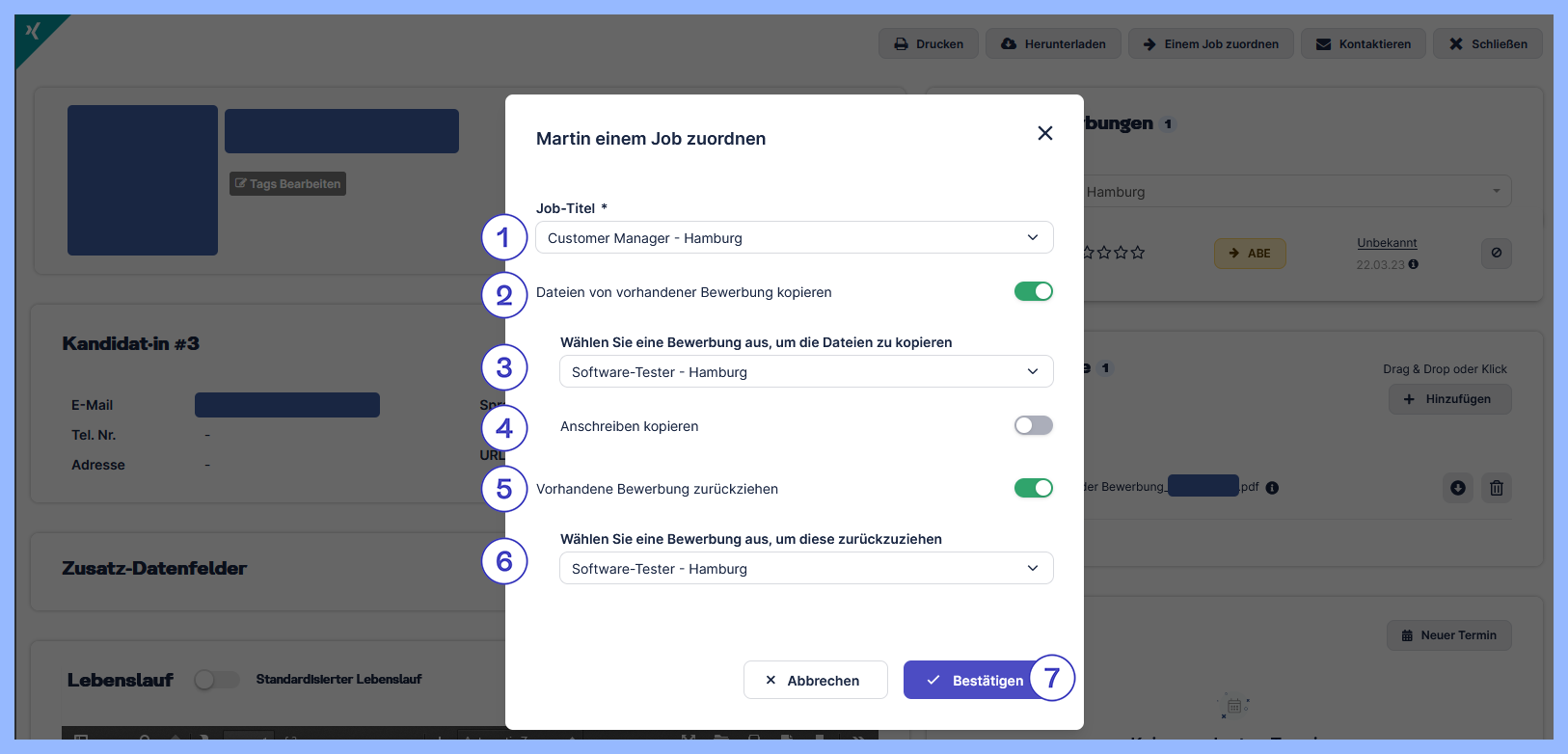 Ist ein·e Kandidat·in auch für eine andere Stelle qualifiziert? Ordnen Sie mit dieser Funktion einer Person einen anderen Job zu. Wählen Sie dazu den entsprechenden Job von der Liste (1) aus und aktivieren bei Bedarf die folgenden Felder: