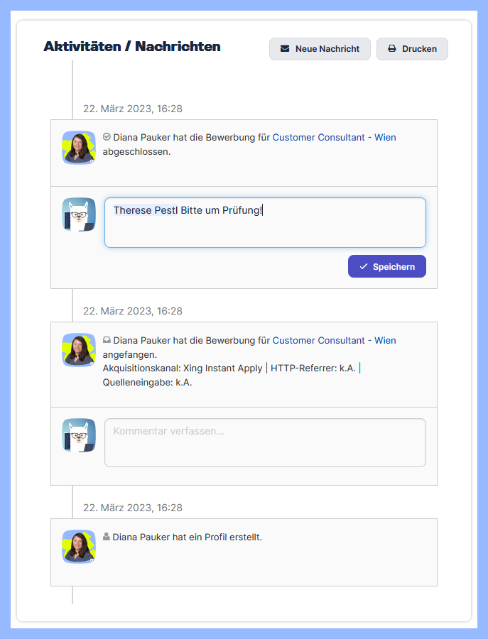 Lesen Sie in diesem Bereich die Nachrichten Ihrer Kandidat·innen, verfolgen Sie die unterschiedlichen Aktivitäten in Form von Systemmeldungen oder kommunizieren Sie mit Ihren Kolleg·innen über die „Kommentarfunktion“.