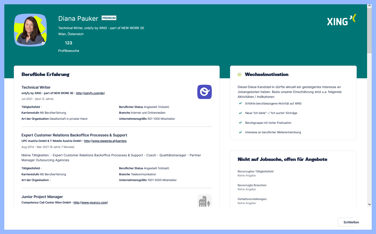 - Personen, die Ihnen empfohlen werden oder die Ihre Stellenanzeigen besucht haben, haben ein XING Profil, welches Sie direkt im XING Jobs Account einsehen können. Enthalten in den Paketen Core, Pro, Ultimate!
