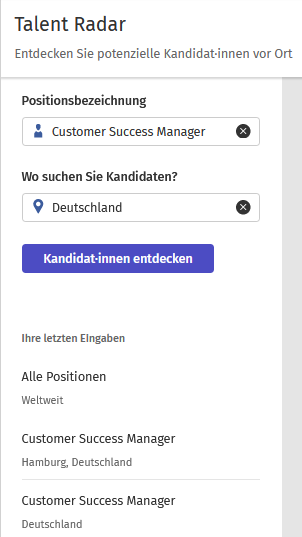 Der Talent Radar visualisiert den Talent-Markt und hilft Ihnen dabei, Ihre Recruiting-Strategie zu optimieren. Hierdurch haben Sie die Möglichkeit, ein besseres Verständnis für den jeweiligen Markt zu entwickeln - und dadurch auch effizientere Suchen sowie besseres Targeting der richtigen Kandidat·innen einzusetzen.