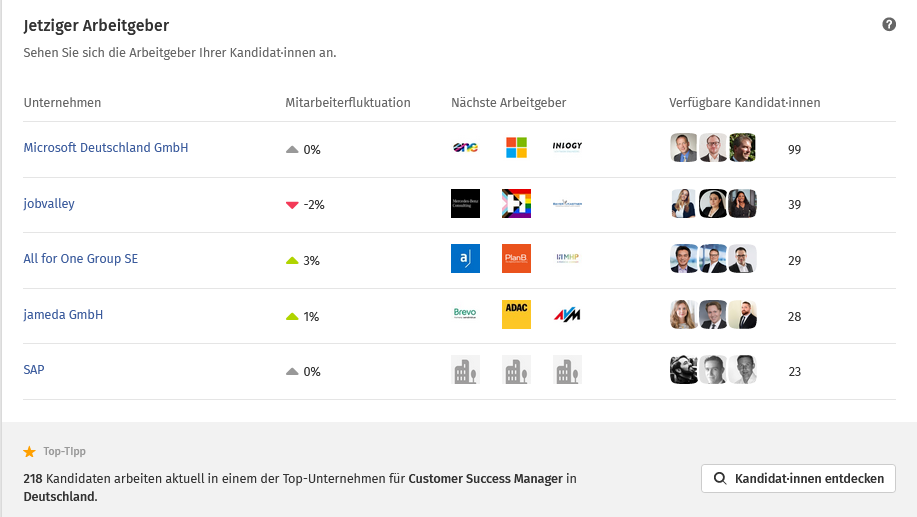 Der Top-Tipp gibt die durchschnittliche Dauer der aktuellen Position an und gibt Hinweise auf Kandidat·innen, die bereits überdurchschnittlich lang in ihrer aktuellen Position arbeiten. Durch diese Funktion lässt sich das Timing für eine Kandidat·innenansprache optimieren.