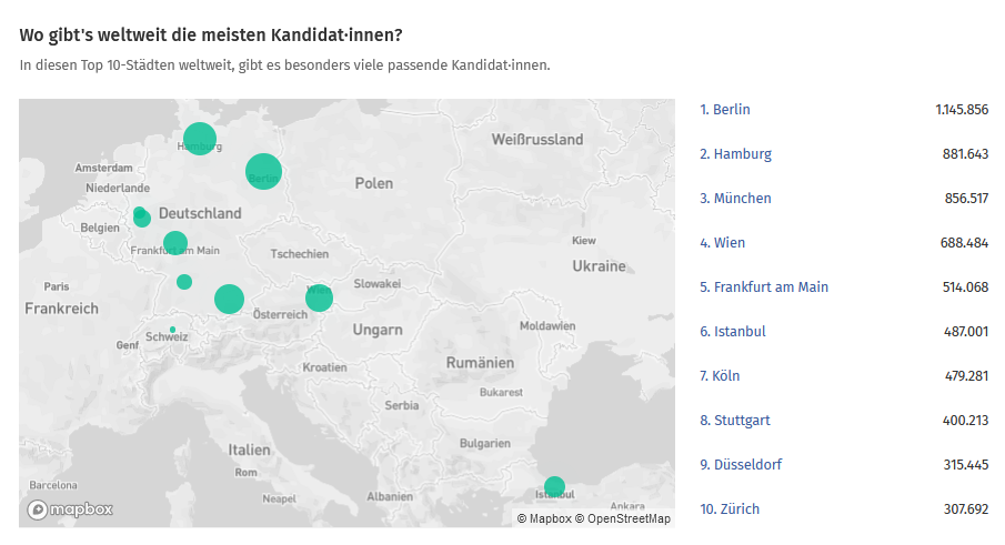 In der Landkarte können Sie einsehen, an welchen Orten die meisten der von Ihnen gesuchten Kandidat·innen arbeiten.
