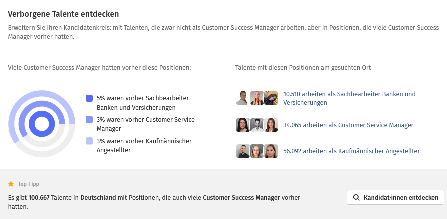 - Abschließend zeigt „Verfügbare Talente“ Personen an, die aktuell bei diesem Unternehmen in der vom Nutzer∙innen gesuchten Position am gesuchten Ort arbeiten.