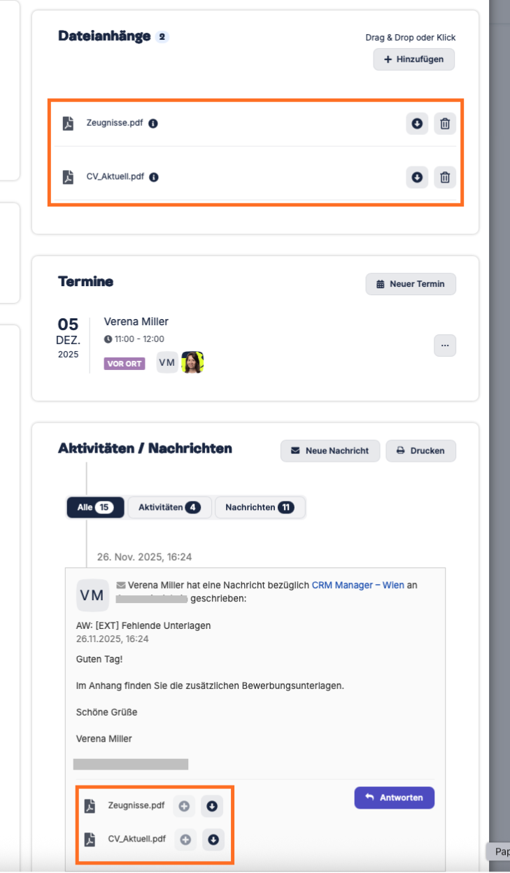 Durch die automatische Ablage von Nachrichtenanhängen unter „Datenanhänge“ in Kandidat·innenprofilen behalten Sie stets den Überblick, und dank der integrierten PDF-Vorschau sparen Sie wertvolle Zeit.