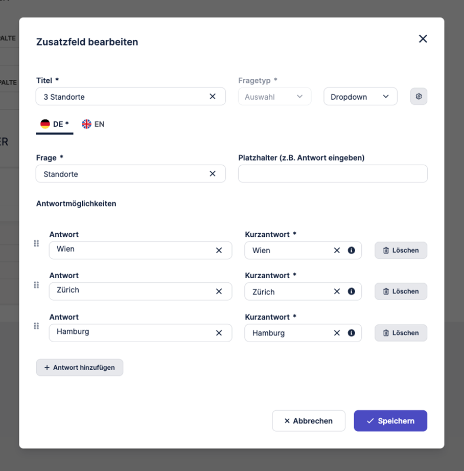 Antwortoptionen in benutzerdefinierten Kandidat·innen- oder Jobfragen des Typs Auswahl und Mehrfachauswahl können jetzt per Drag & Drop neu angeordnet werden.