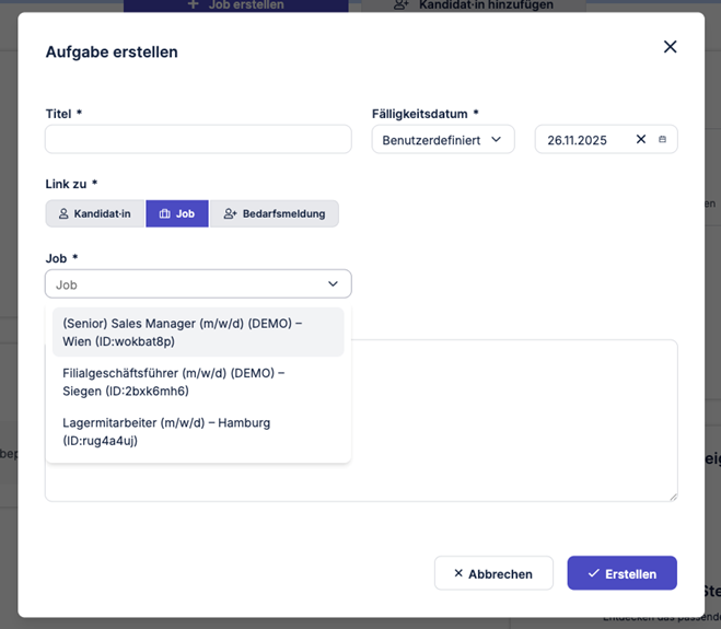 Job-Auswahllisten zeigen jetzt neben Titel und Standort auch die IDs der Stelle. Das erleichtert die sichere Unterscheidung von Jobs mit identischem Titel und Standort.