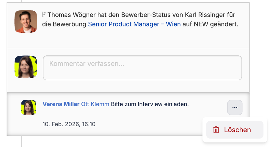Ab 16.02.2026 können Sie Ihre eigenen Kommentare im Kommunikationsverlauf von Kandidat·innenprofilen löschen.