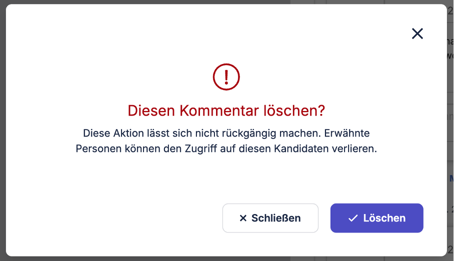 Enthält der Kommentar eine @Nutzer-Markierung, weisen wir Sie vor dem Löschen darauf hin: Die erwähnte Person kann dadurch ggf. den Zugriff auf das Profil bzw. die Bewerbung verlieren.