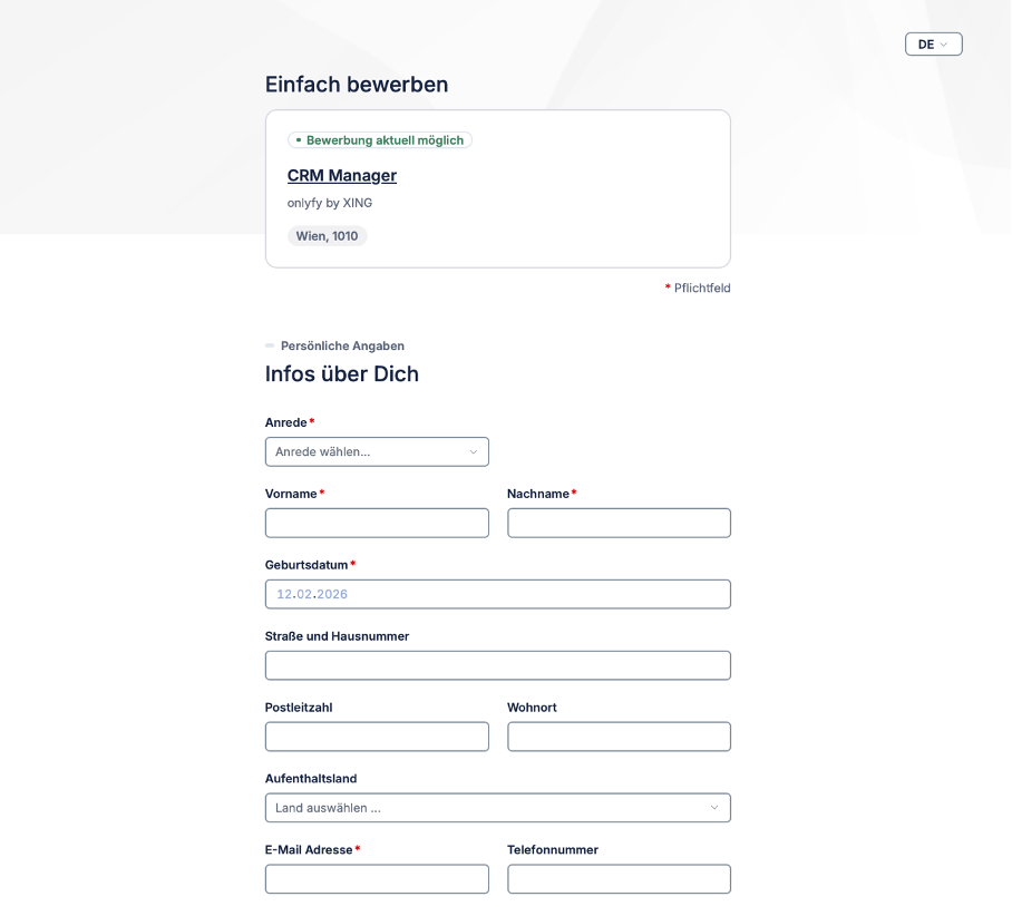 Die Basisinformationen im Bewerbungsformular werden jetzt in zwei Spalten dargestellt (E-Mail, Name, Adresse, Telefonnummer, Geburtstag). So wird das Formular insgesamt kürzer – Kandidat·innen kommen schneller durch den Ausfüllprozess.