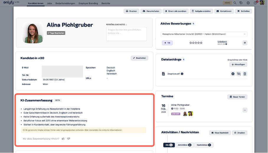 Kandidat·innenprofile enthalten jetzt eine KI-basierte Zusammenfassung der CV-Daten. Sie hebt wichtige Erfahrungsstationen hervor und weist auf mögliche Warnsignale hin (z. B. Erfahrungslücken), so kann die Vorauswahl und die Screening-Zeiten optimiert werden.