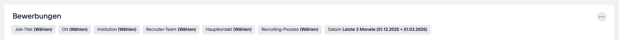 Team Pinboard > Editieren > Filter. Wir empfehlen diese Standard-Optionen zu verweden: Job Title, Recruiter Team, Institution, Date, Main Contact, Job City, Hiring Process.