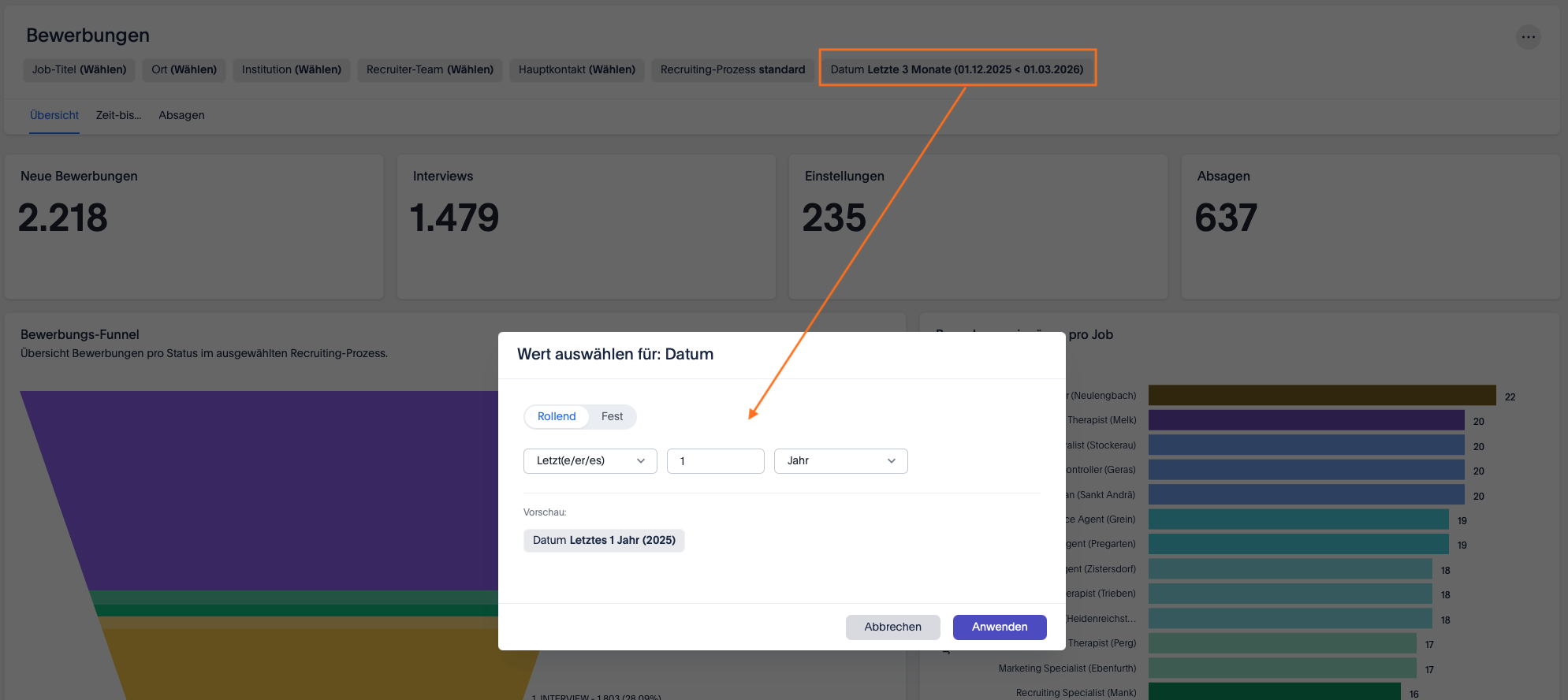 - Kandidat·innen: Überblick über Ihren Talentpool (aktive Kandidat·innenprofile, nach Tag, Ort, Geschlecht, Systemsprache)