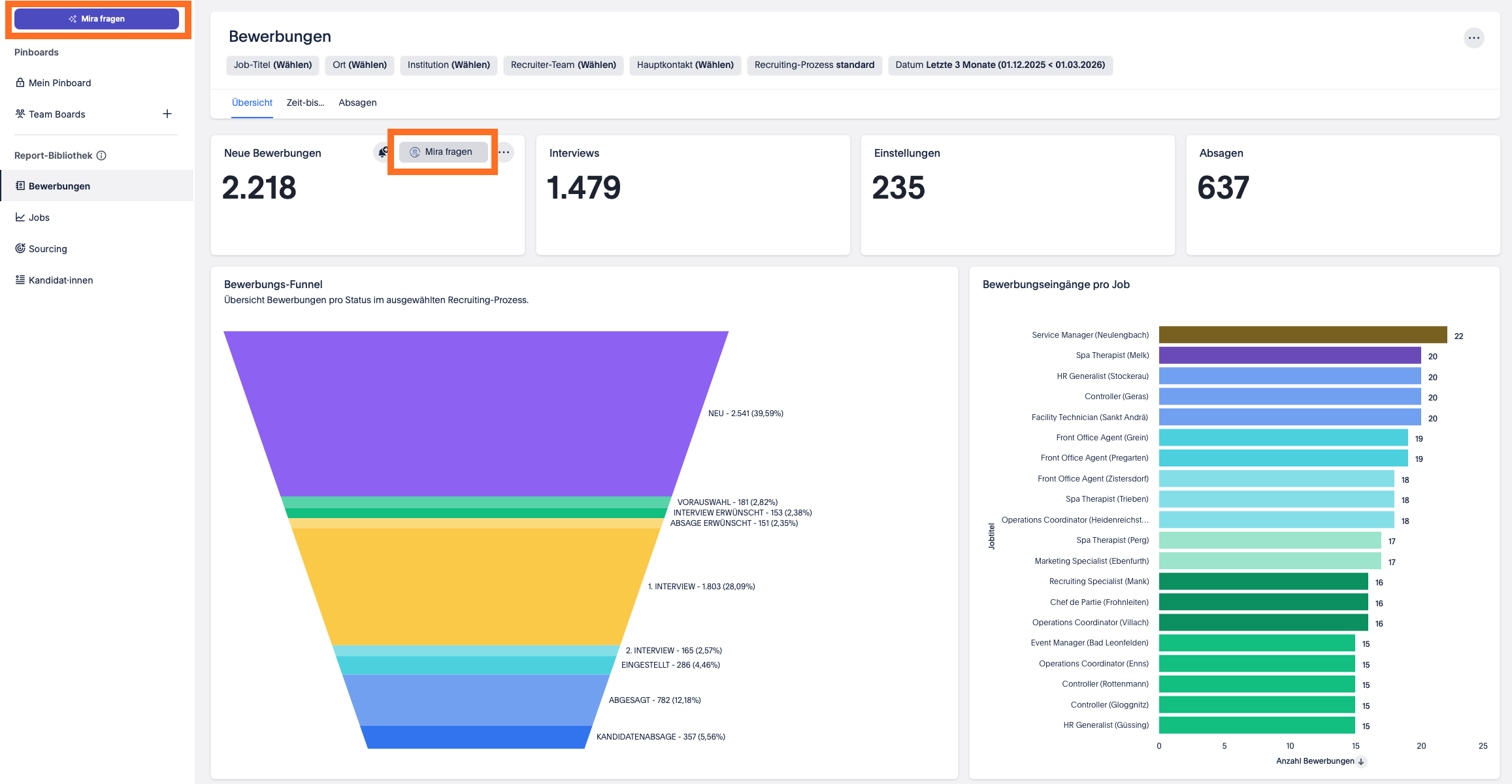 - Mira – die KI-Assistentin: Analysiert Ihre Recruiting-Zahlen und gibt Handlungsempfehlungen.