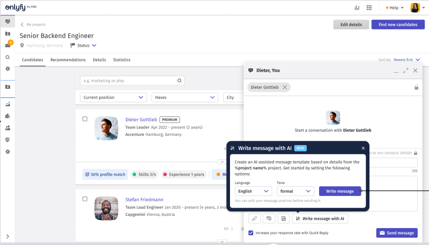 The AI is designed to generate optimal messages and consider the most important best practices for active sourcing communication. This leads to an increased response rate for you.