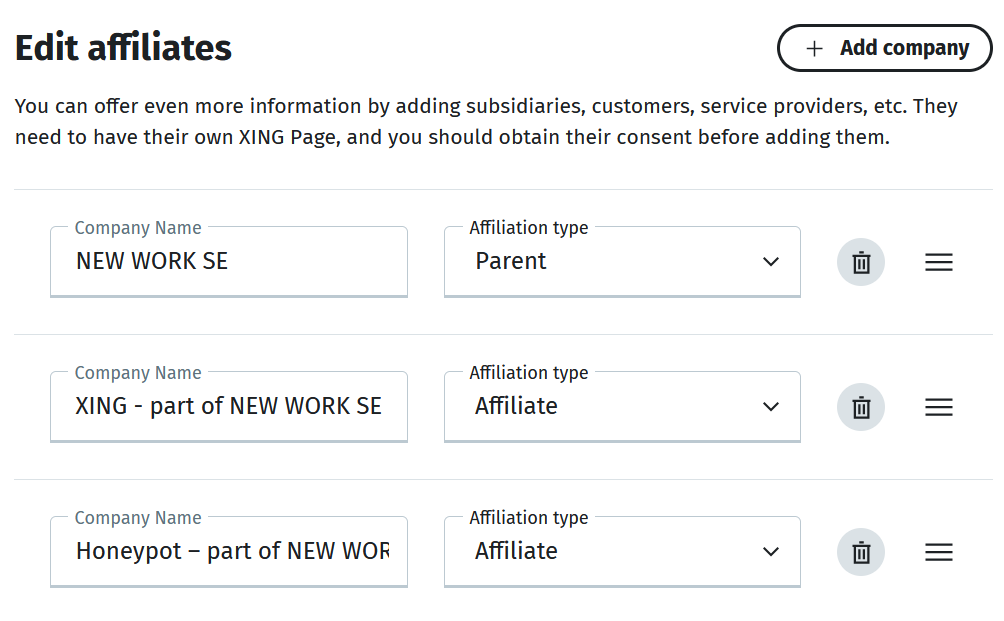 On the employer branding profile on XING, in the "About us" section, you have the option of showing connections to other companies, e.g. subsidiaries or affiliates, but also clients, service providers, etc.