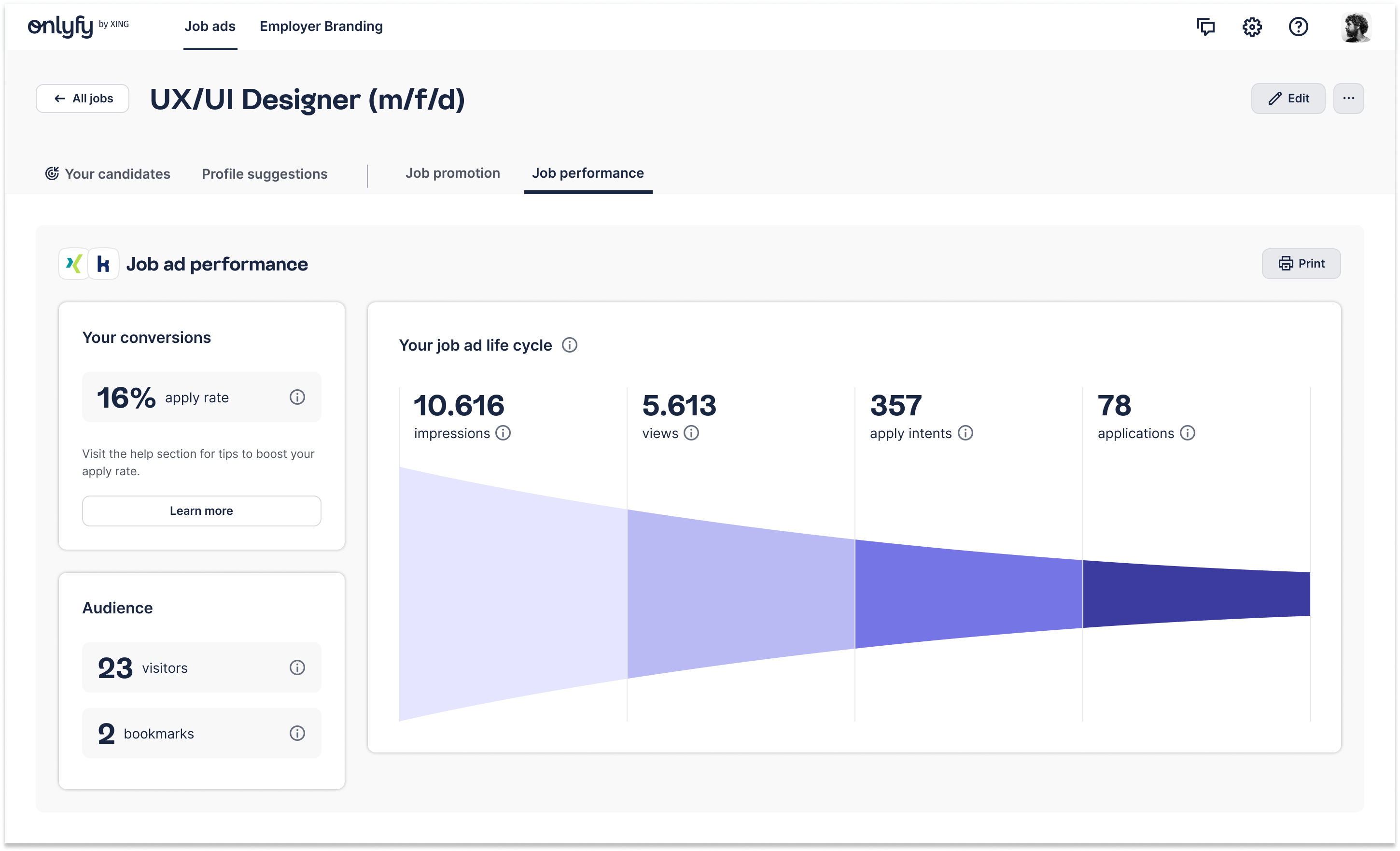 (apply rate, impressions, views, apply intents, applications, visitors, bookmarks) - Benefit from a clear visual representation of your job ad statistics for easy understanding.