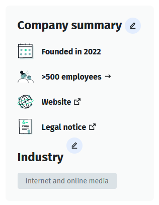 Present your most important products and / or services in the section "About us" of your Employer Branding Profile. Here you can find the "Company summary" to publish your numbers, website, industry and legal notice.