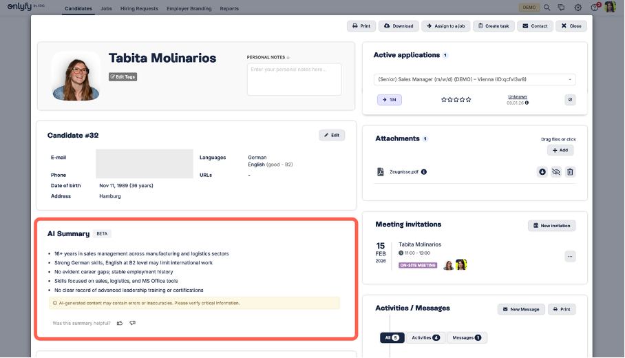 Candidate profiles now include an AI-generated summary of CV data. It highlights key experience milestones and flags potential warning signs (e.g., experience gaps). Helps recruiters screen faster—and reduce time to the key decision: proceed with this application or not.