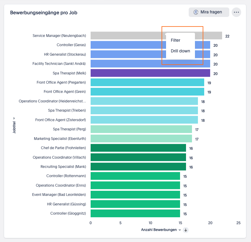 Beispiel: Analyse "Bewerbungseingänge pro Job" > Rechtsklick auf den Job z.B. "Marketing Manager" > Filter > Das gesamte Dashboard wird auf den Jon "Marketing Manager" gefiltert UND/ODER Rechtsklick > Drilldown "Akqusitionskanal" > Bewerbungen für den Job "Marketing Manager" nach Akqusitionskanal.