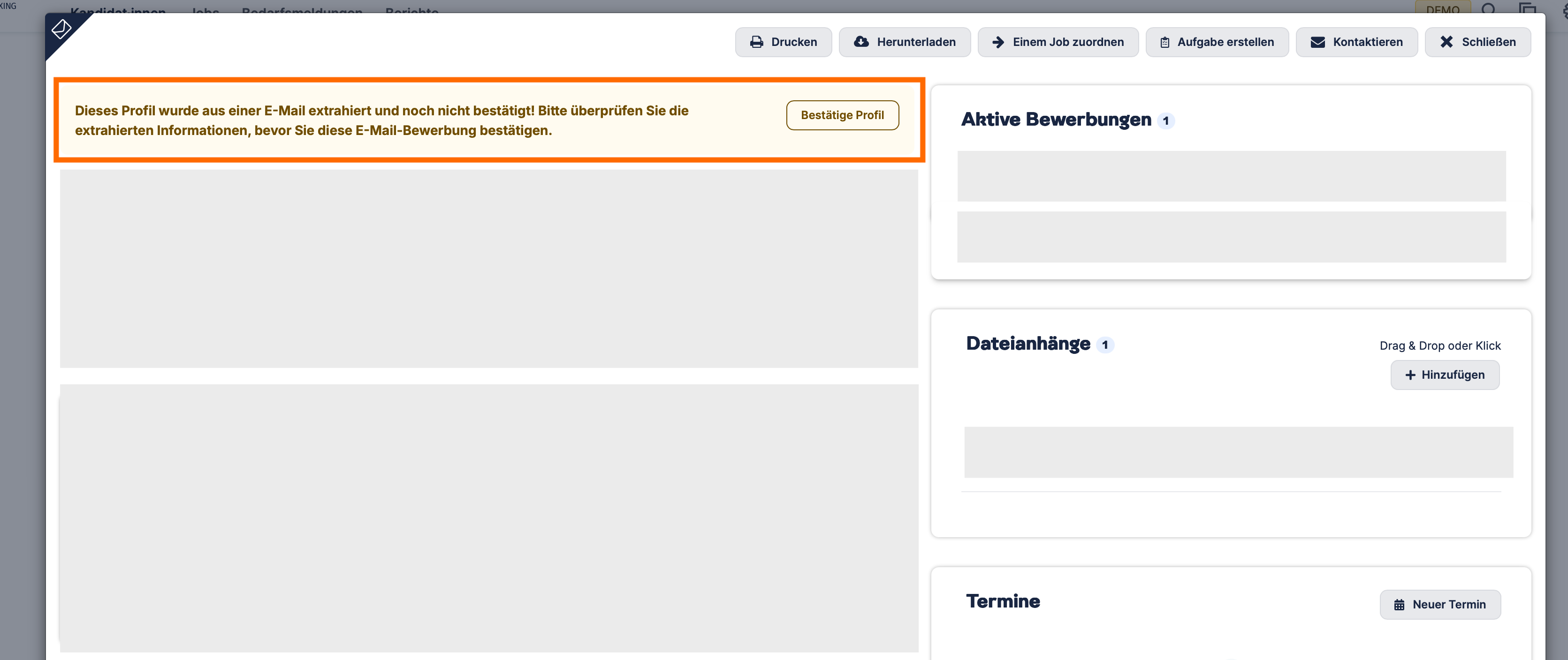 - Transparency & GDPR: Data from email applications is parsed automatically and may contain errors in rare cases—for example, when an application is forwarded and the sender’s email address doesn’t match the candidate’s email address. That’s why parsed data must be reviewed and approved before the process begins.
